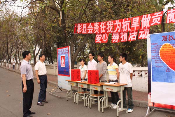 本站讯(马琪报道)近日学院团委连续发出《倡议书》,倡议广大师生员工积极行动起来,踊跃向灾区捐款、捐物,支援抗旱救灾。13日、14日学院学生会、院长学生助理团、学院青年志愿者协会和电子电气工程系团总支积极响应院团委倡议,自发组织在学院两大校区设立捐赠点接收师生捐赠。