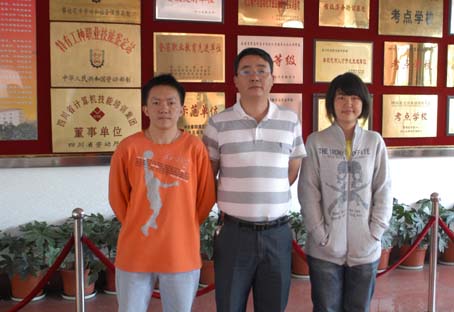 | 图为基础部外语教研室主任王联勋(中)与获得一等奖的学生李强(左)、李凌娟(右)。
